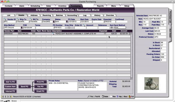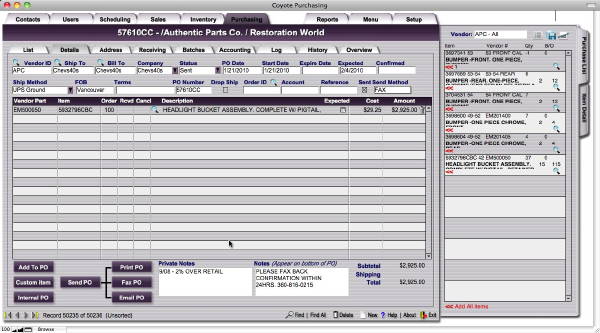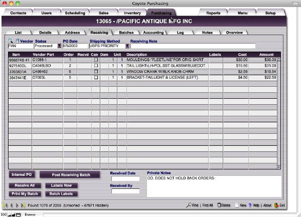 Coyote stores notes about orders, notes about shipments, notes about sales orders, purchase orders, clients, vendors, and many customizable options. Client records and logs are integrated into the purchasing module--the same as in other Coyote modules--so that purchasing is just one more supremely integrated part of the fabric of your organization. You are able to see details about orders from within the client screens as well as details about individual facets of orders from within the purchasing screens. Coyote has you covered.